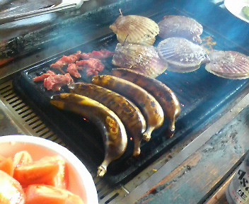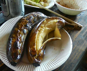 キミジャグからは私一人だったんですが、みんな優しい方ばっかりだったので安心。 吉村君やら大高君やら、お名前は知ってるけどあまりお喋りをしたことがなかった方達がいらっしゃっていて、すごーく充実した時間を過ごす事が出来ました。 水戸でお芝居をしている人たちの生の意見をいろんな方向から聞く事が出来てよかった。 キミジャグも頑張らなきゃなー。 それはそうと、このBBQに来て産まれて初めて食したものが。 焼きバナナー!! ふおおおおお。真っ黒。でも中身は蒸されたカンジでもちもちしてます。 ガトパン団長のキム兄が作ってらっしゃったんですが、味は・・・。 うーん・・・。 昔食べたタロ芋の味に似てる???? 匂いは納豆です。 BBQの際には、どうぞお試しアレー。